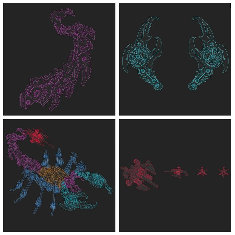 .Design Story: We have been figuring out how to make the metal more sense and the answer is color. Coloring different metals brings unique performance effects. This scorpion model is created with the combination of mechanical, war machines and other elements for a beautiful overall effect.