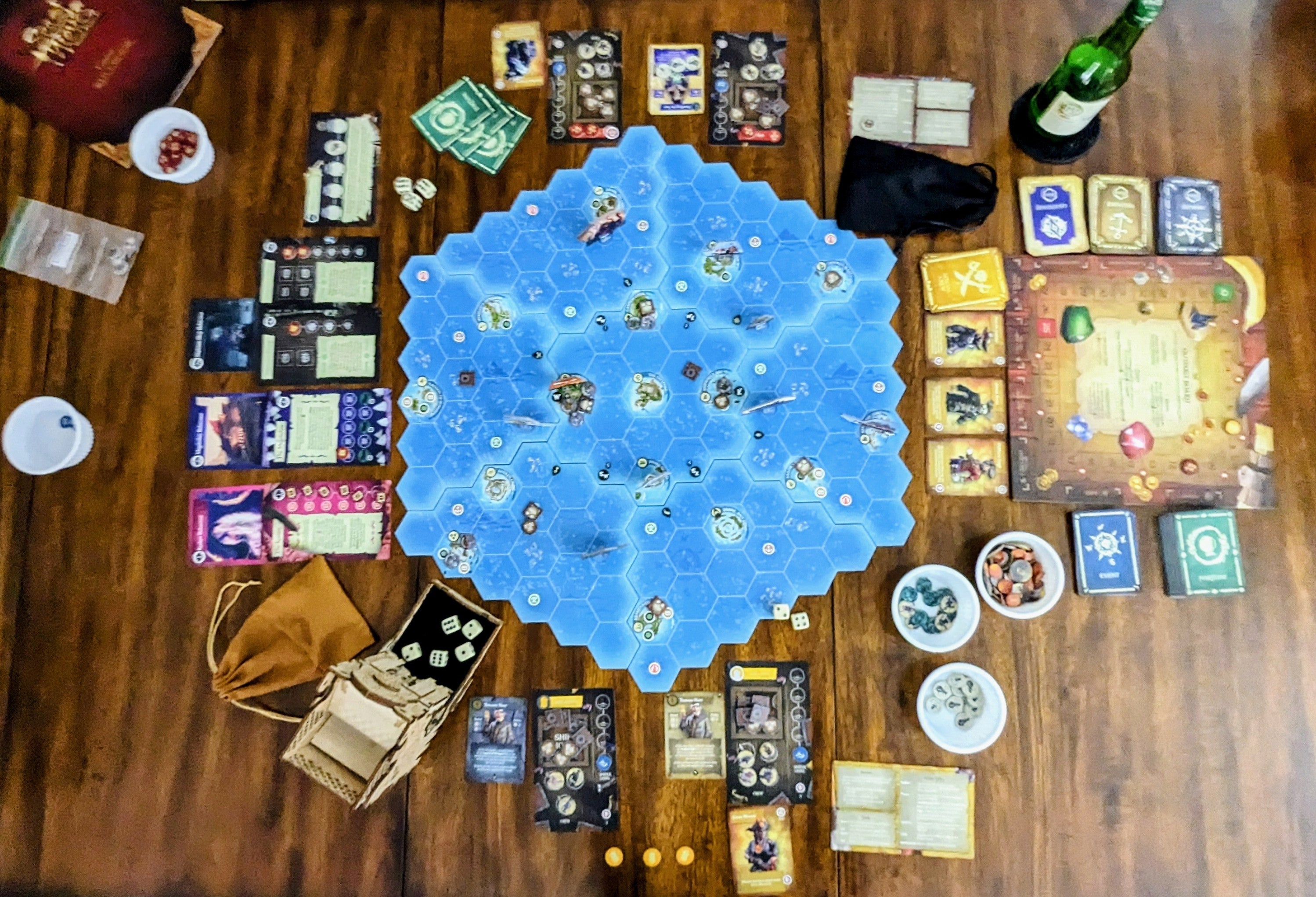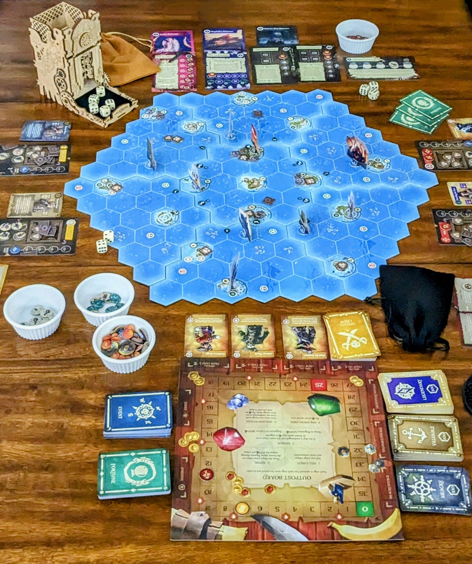 The playing area, special crew, locations of treasure and enemies, and events that occur are randomised each game, meaning that every game will be different even before factoring in the actions and decisions made by the players at the table.