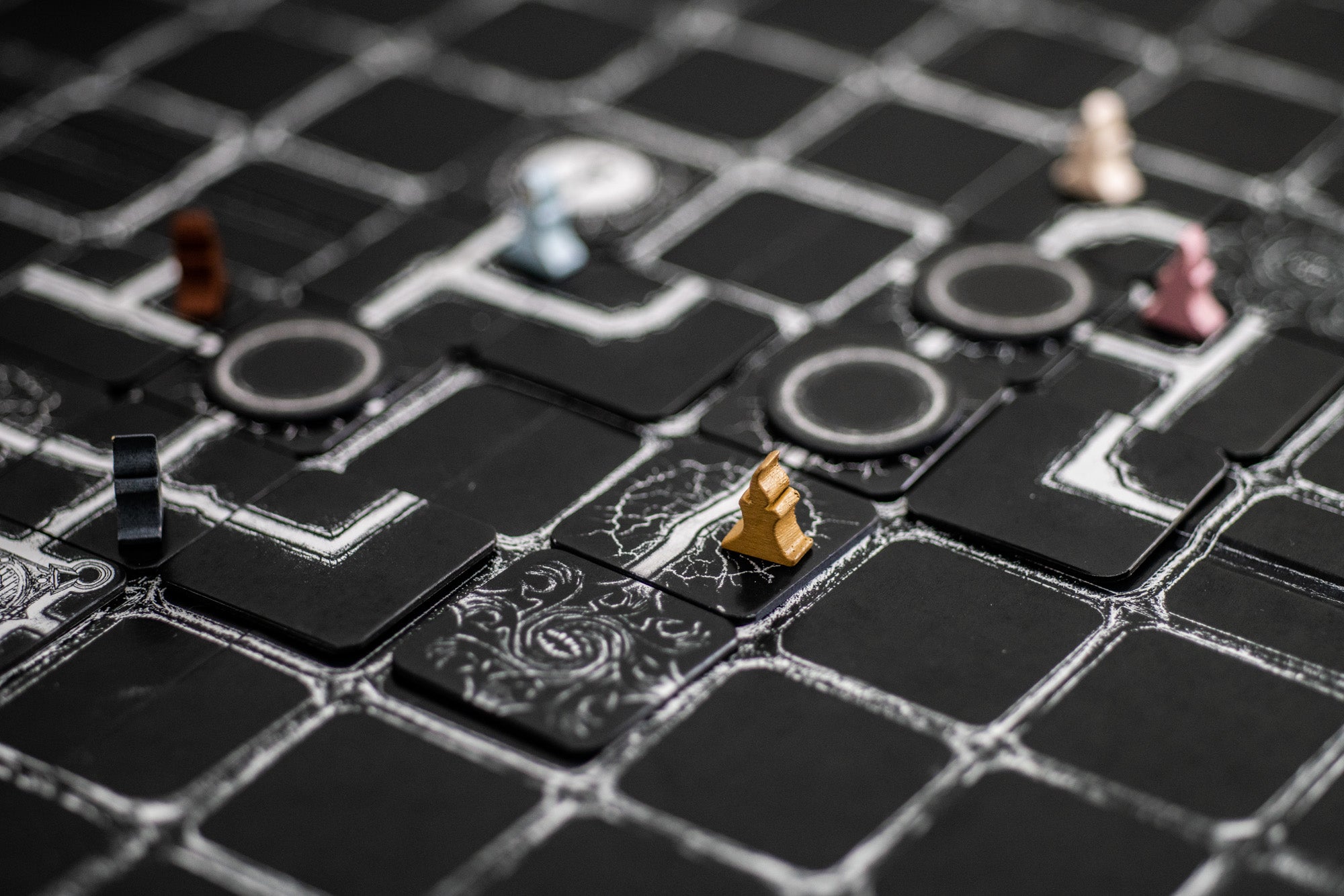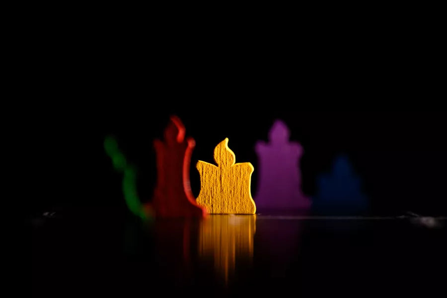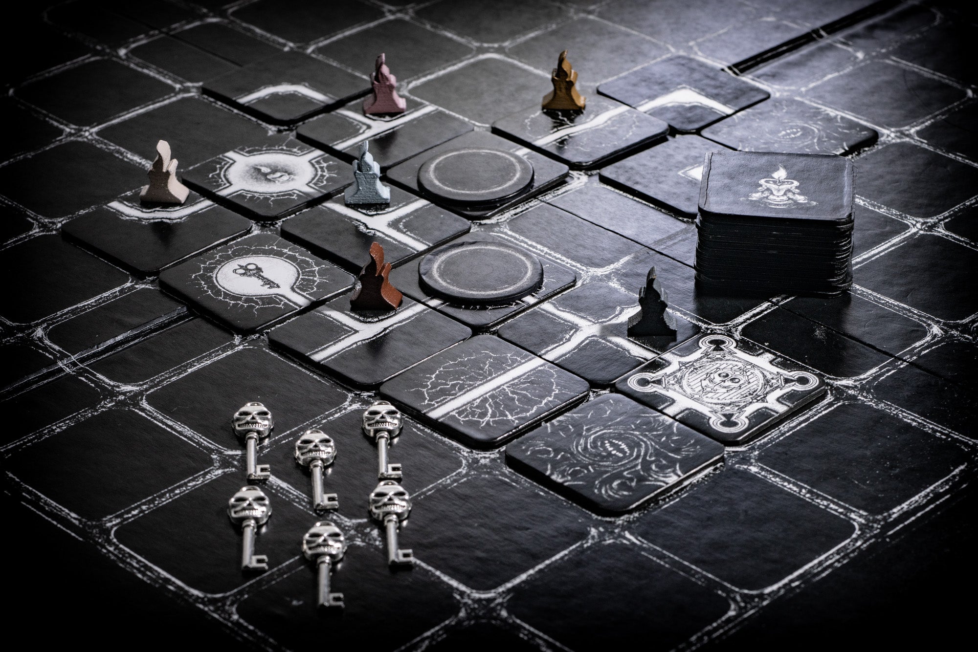 Escape won't be easy as each player's visibility is limited by the weak light of their candle. They illuminate only tiles directly connected to their own, and when players move, tiles that fall into darkness are removed from the game. Doubling back the way you came only opens new paths, the old ones being lost forever with critical keys and gates vanishing if your light move away from them...