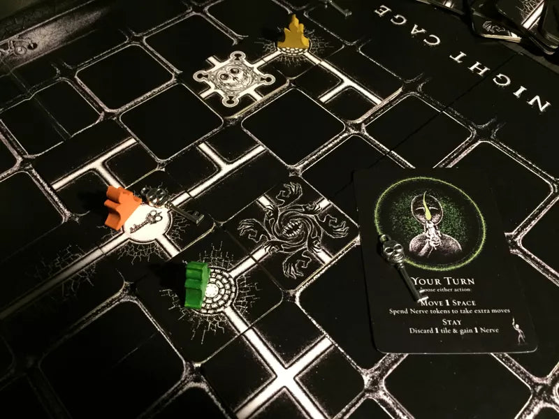 The Night Cage is a fully co-operative, horror-themed tile-placement game that traps 1-5 lost souls within an unnatural labyrinth of eternal darkness. To win, players must each collect a key, find a gate, and escape as a group.
