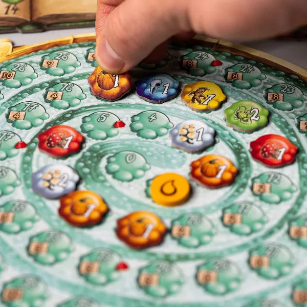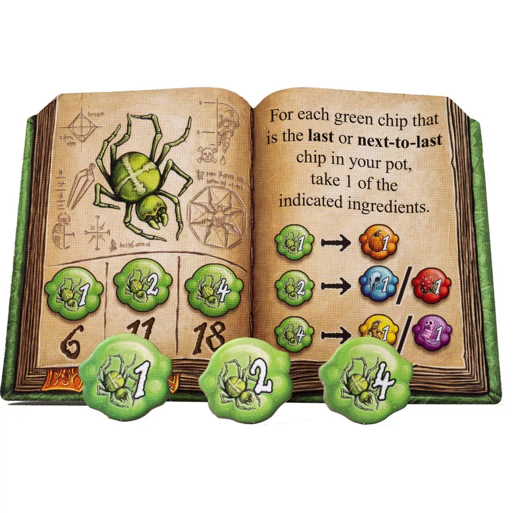 Each player has their own bag of ingredient chips. During each round, they simultaneously draw chips from their bags and add them to their pots. The higher the face value of the drawn chip, the further it is placed in the pot's swirling pattern, increasing how much the potion will be worth. Push your luck as far as you can, but if you add too many cherry bombs, your pot will explode!