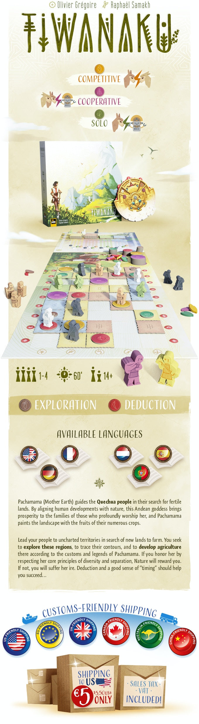 In Tiwanaku, first announced as Pachamama, you lead your tribe into unknown territory in search of new lands to cultivate. Your goal: To explore regions and draw outlines to develop cultures according to the customs and legacies of Pachamama. If you honor Her by respecting the great principles of diversity and complementarity, Nature will reward you; otherwise, you will suffer his wrath. In this race, risk-taking, deduction, intuition, and a good sense of timing should allow you to get through.