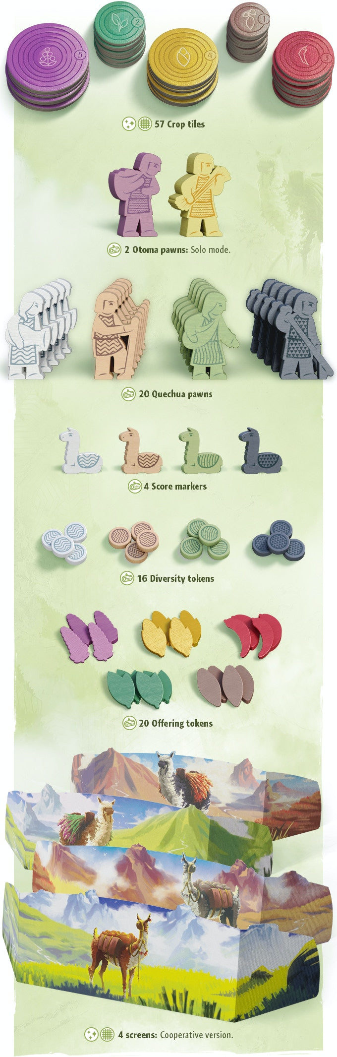 Lead your people to uncharted territories in search of new lands to farm. You seek to explore these regions, to trace their contours, and to develop agriculture there according to the customs and legends of Pachamama. If you honor her by respecting her core principles of diversity and separation, Nature will reward you. If not, you will suffer her ire. Deduction and a good sense of “timing” should help you succeed…