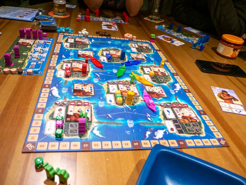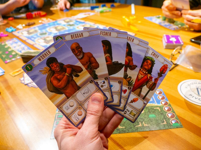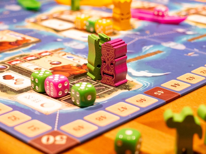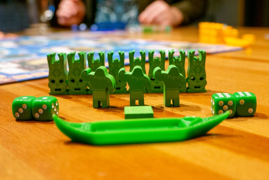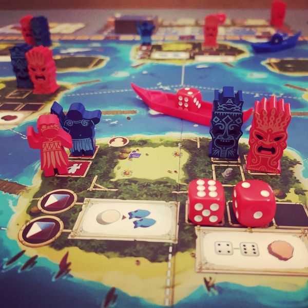 Tungaru sets players as early Polynesians in this dice placement and resource conversion, medium-weight euro game. Players will jump from island to island in an effort to recruit Nomads as new tribe members, colonise land, spread their culture and exchange goods. Players use dice as workers, Leader cards which are blind revealed which are then given to your neighbour and custom shaped meeples specific to their tribe. All in an effort to be the most successful tribe!
