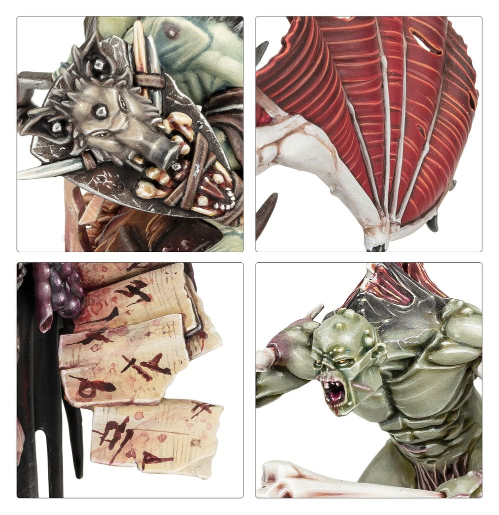 This gruesome battleforce is led by Grand Justice Gormayne, a grim orator who whips up his fellow cursed courtiers into a monstrous and macabre furore. His ghoulish force consists of swift and shrieking Morbheg Knights, brutal Crypt Horrors, and a unit of eager Cryptguard – all advancing to the thump of human-hide drums, beneath pennants of flayed flesh.