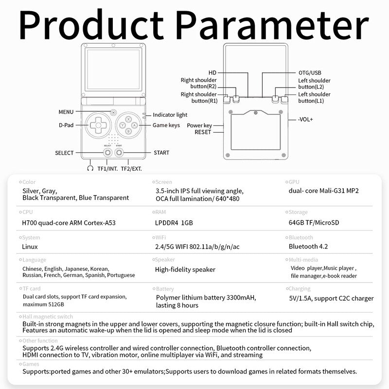 - .High-definition screen, 3.5-inch IPS full-view, OCA fully bonded 640*480 pixels, equipped with Cortex-A53 processor for smooth retro gaming experience.