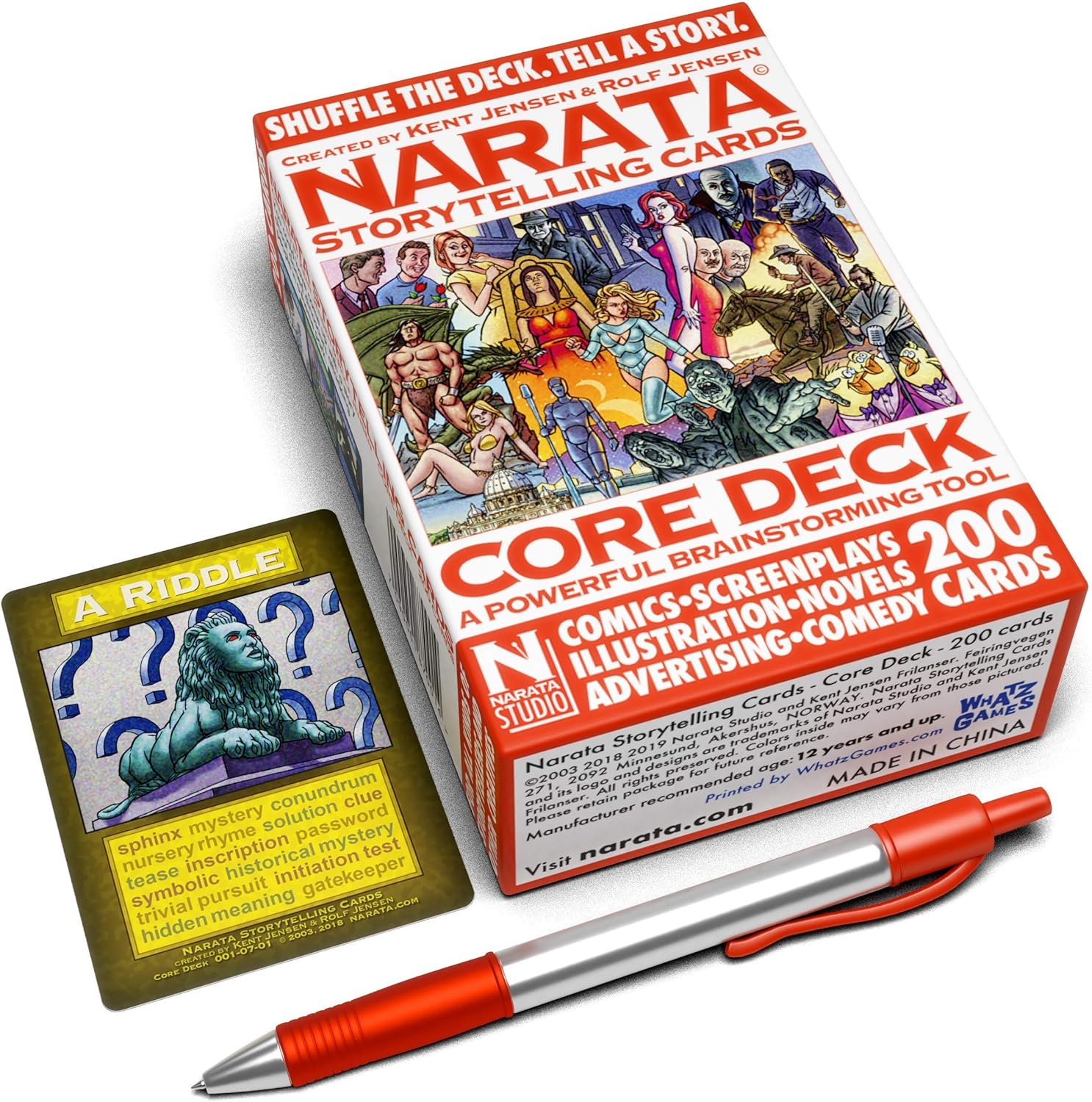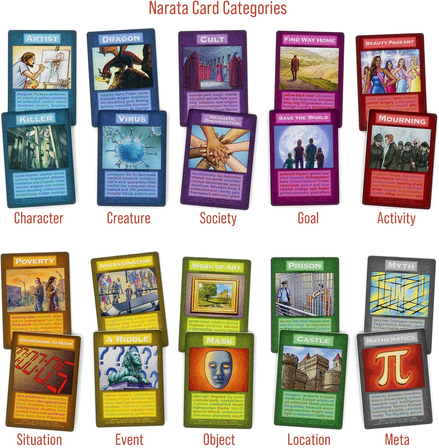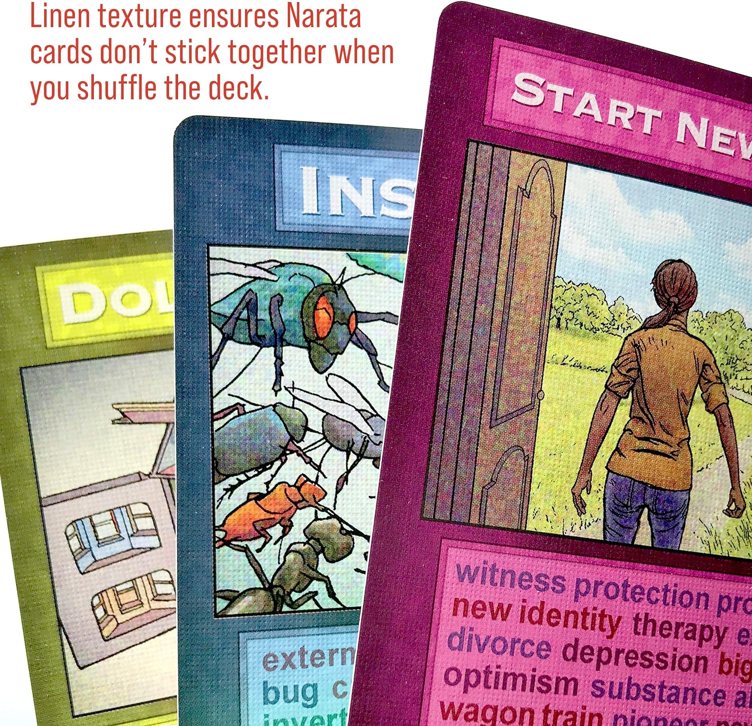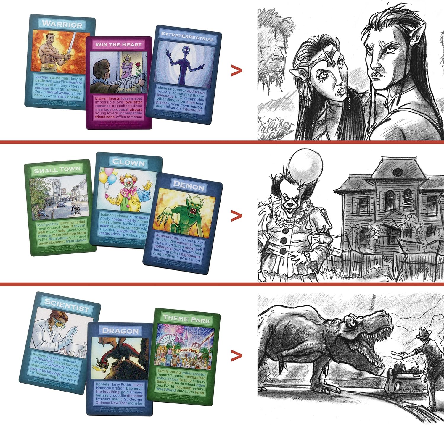 As an example, say you shuffle the Narata deck and pick these cards: Small Town, Clown, Demon. You could have come up with the concept for that famous bestselling horror novel.