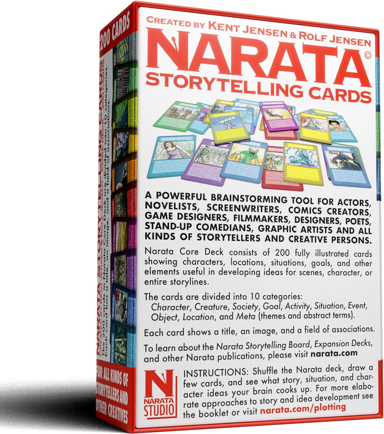200 fully illustrated cards display a variety of characters, situations, locations, etc. A few cards picked at random can suggest surprising story possibilities that may not otherwise occur to you. Narata can also be used to methodically brainstorm and develop complete three-act stories from scratch. You find suggestions for working with Narata in the 24 page booklet.