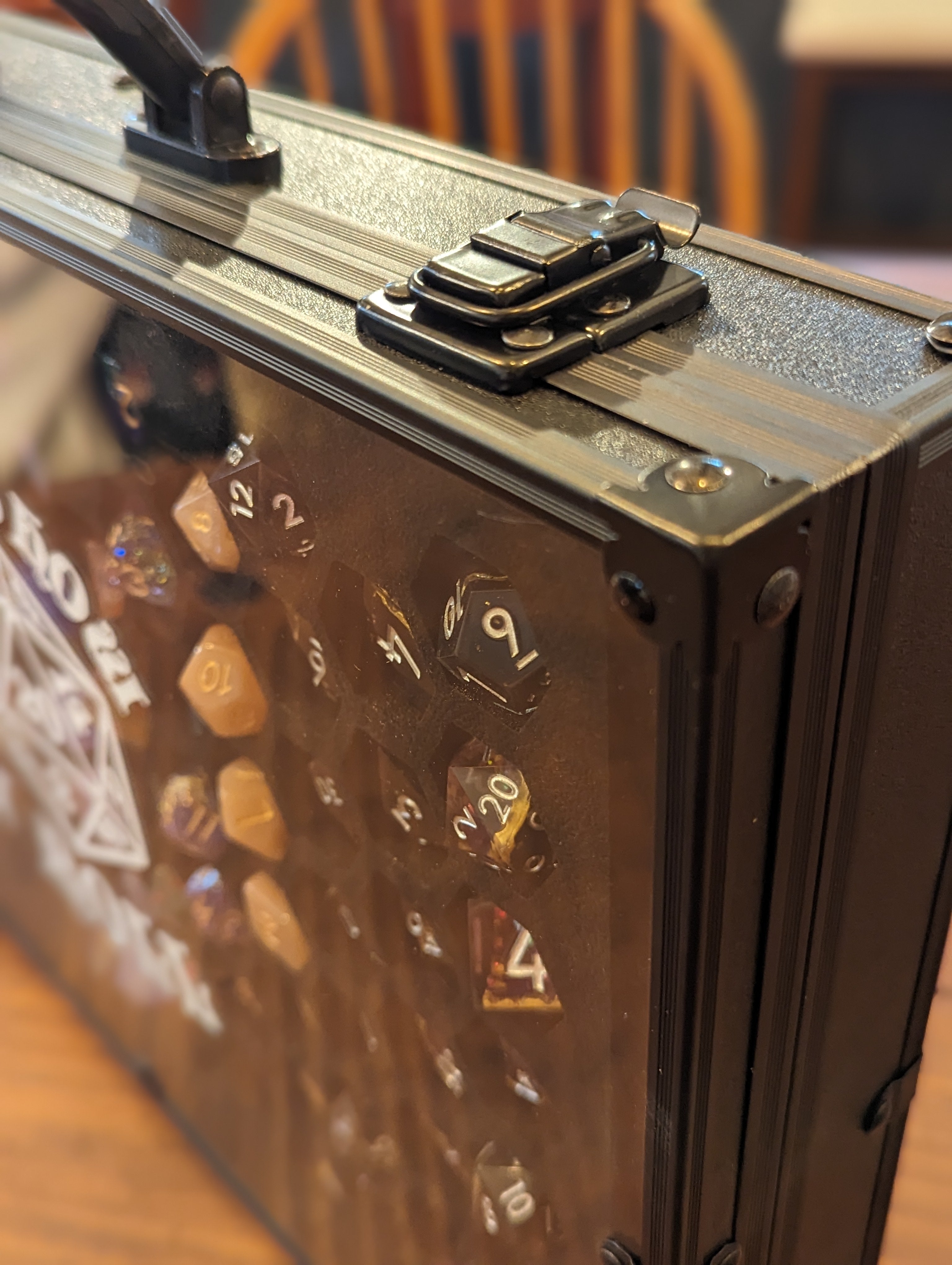 Our new upgraded case is aluminum lined on the outside, with sturdy latches and handle for easy transport. Four rubber feet make it convenient to leave your case standing up for a smaller profile when storing (or for showing off on the game table). Our case is specifically designed to be 'spill proof'- Meaning when you travel the gap between the foam and plexiglass top is calculated precisely to make sure none of your dice slip out of the slot and get all jumbled. And of course, the plexiglass cover is shatter proof!