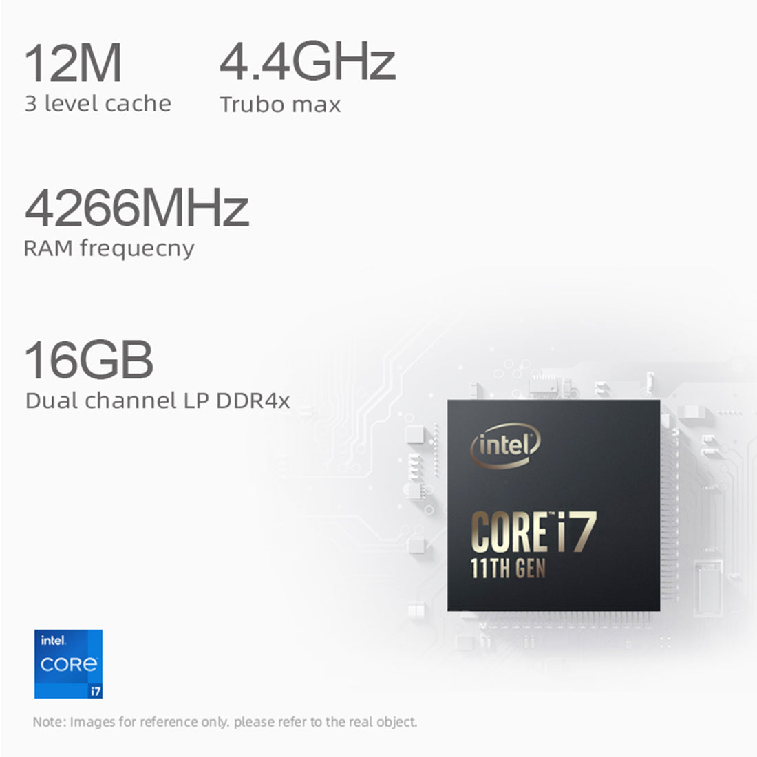 .CPU: 11th Core Tiger Lake-Y series Core i7-1160G7; main frequency 1.2GHz~2.1GHz; turbo frequency up to 4.4GHz; 3Level cache: 12MB.