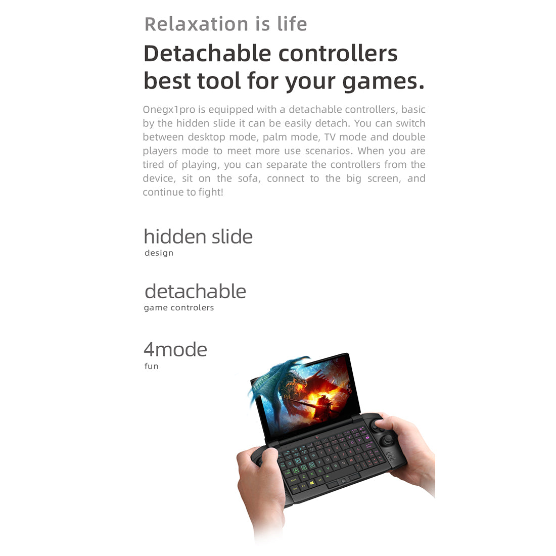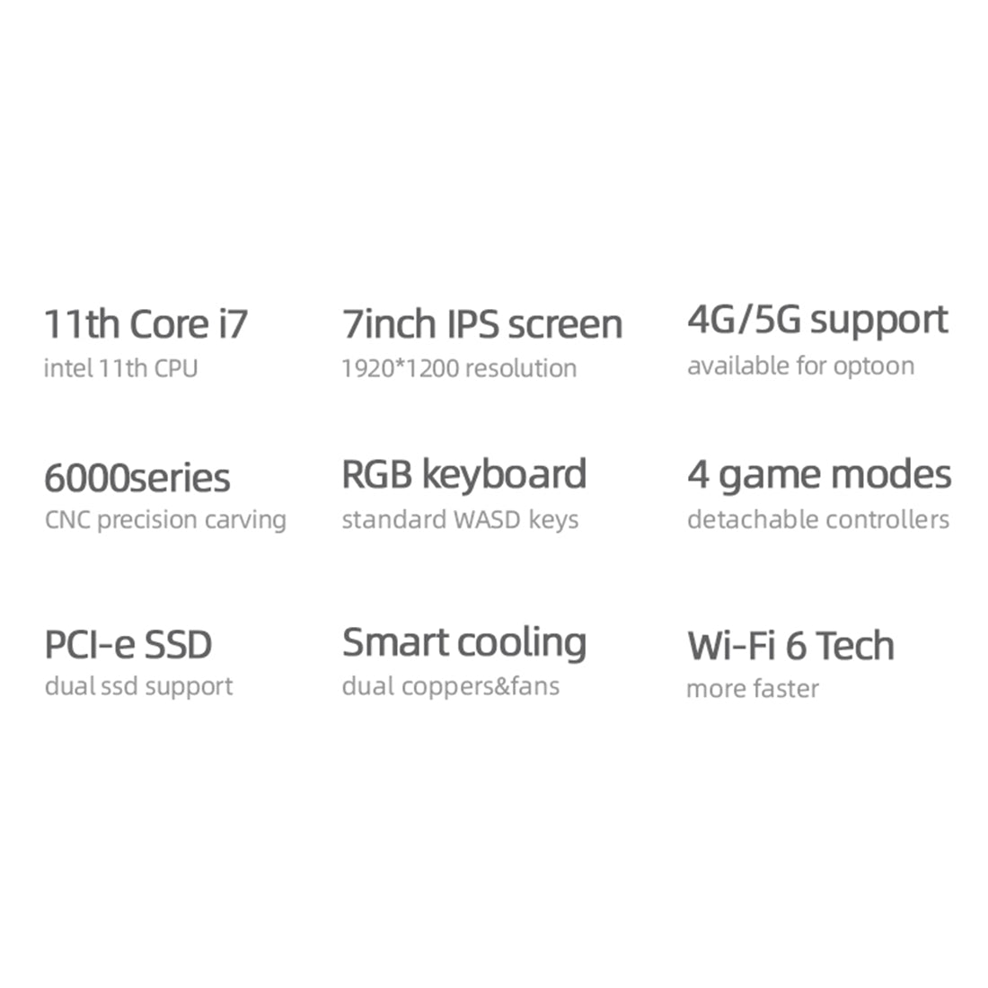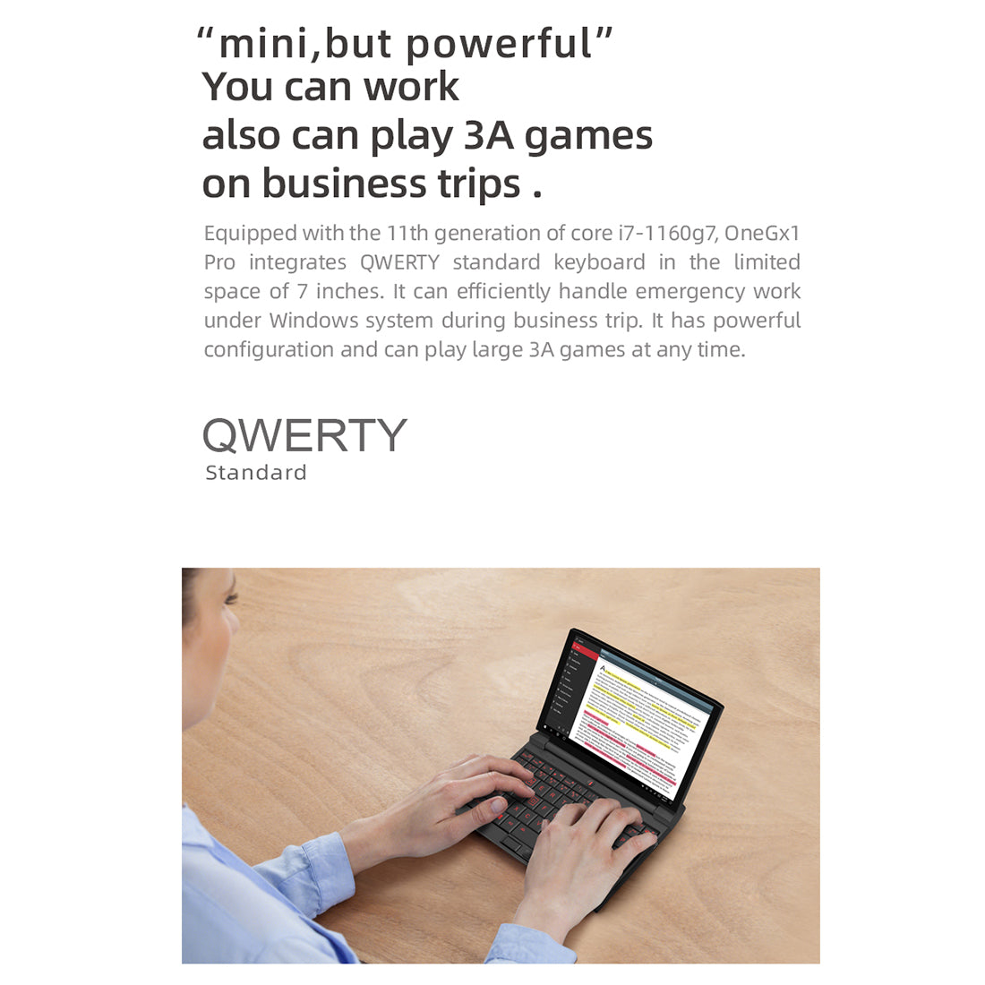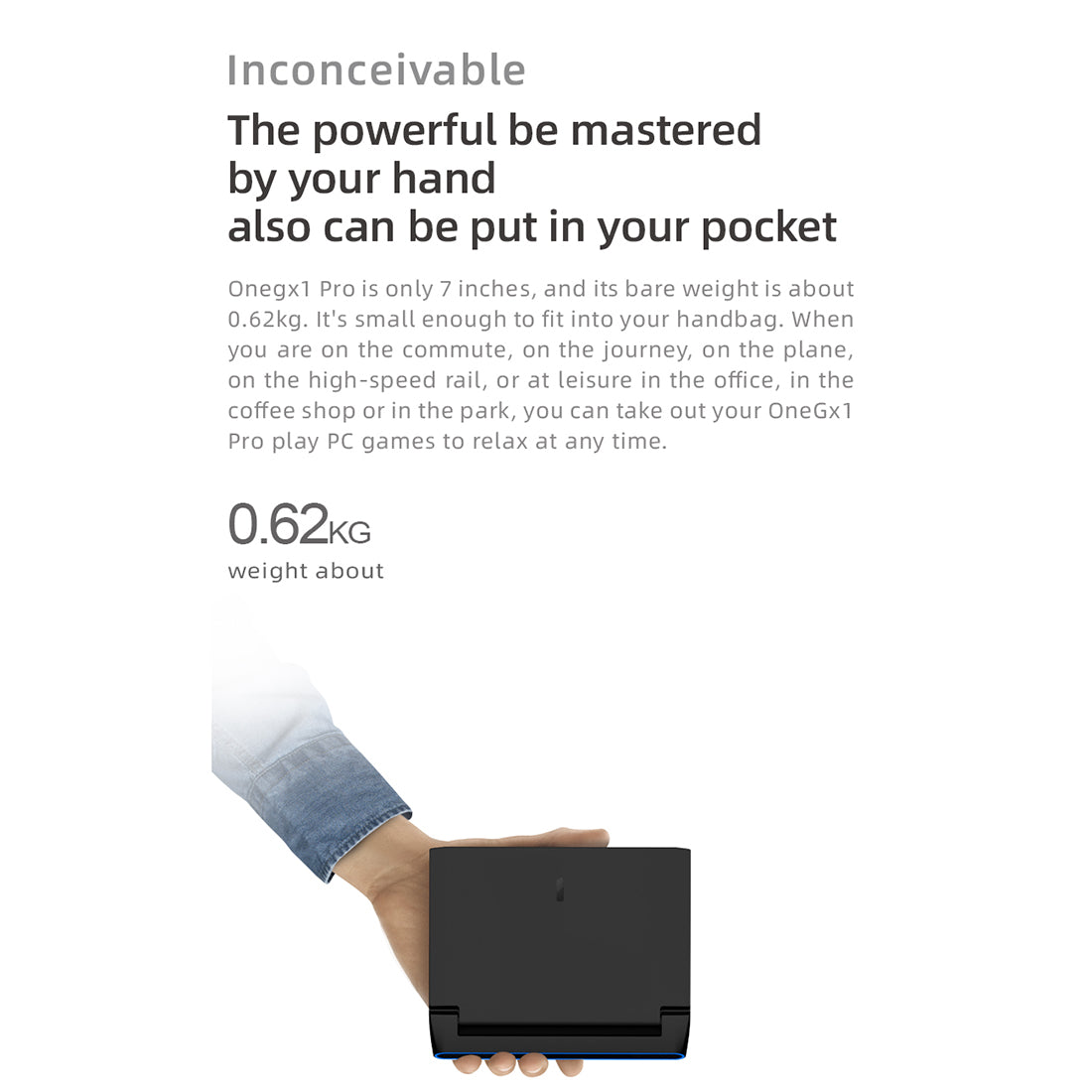 5. OneGx1 Pro equipped with the 11th generation Core i7-1160G7, integrates a QWERTY standard keyboard in a limited space of 7 inches, and can efficiently handle emergency work under Windows during a business trip.6. Small and Portable: Your gaming notebook can also be put in your pocket. One Gx1Pro has a body of only 7 inches and net weight is about 0.62kg, which is small enough to fit into a portable bag. On the commute, during the journey, by plane, high-speed rail, office leisure, coffee shop or park leisure, etc., you can take out your Onebook OneGx1 Pro to play PC games and relax at any time.7. RGB Backlight: Cool full RGB keyboard light, ready to fight for you! Even in the dark night, every key position is clearly visible. Under the guidance of RGB light, let go and fight! OneGx1 Pro provides you with a variety of lighting modes at the same time. You can choose which one you like or turn it off according to your personal preference.