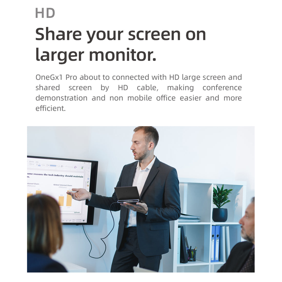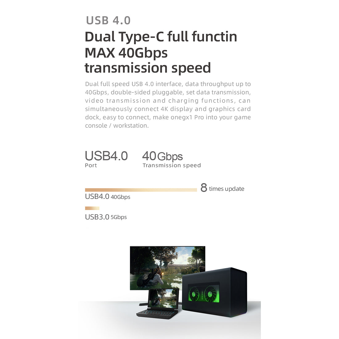 1. TYPE Interface: USB 4.0. Dual Type-C full functin MAX 40Gbps transmission speed. Dual full speed USB 4.0 interface, data throughput up to 40Gbps, double-sided pluggable, set data transmission, video transmission and charging functions, can simultaneously connect 4K display and graphics carddock, easy to connect, make onegx1 Pro into your game console/workstation.