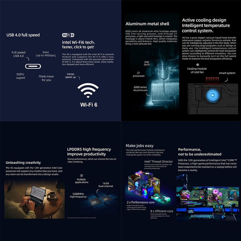 .All-aluminum Metal Material: Made of 6000 series aluminum material in CNC precision technology through 27 processes, the lightweight PC with a sturdy body boasts the thinnest thickness of 9.8mm, a delicate touch, along with a concise and fashionable outline combining portability and durability, greatly increasing excellent texture for a captivating impression.
